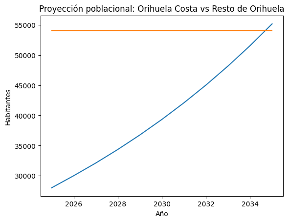 👉 Con un crecimiento del 7 % anual, Orihuela Costa supera en población al resto del municipio en torno a 2035.