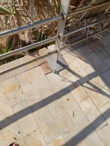 Las barandillas superior e intermedias existentes se están reutilizando. El riel superior ha sido limpiado, pero algunas de las soldaduras están mal y hay áreas con daño al acero inoxidable. Los rieles intermedios tienen áreas que han sido usadas y no se ha intentado limpiarlas. Algunas están muy mal contaminadas.