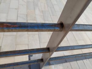 Los postes tienen 3 agujeros para los rieles intermedios. Sin embargo, el diámetro del agujero es exactamente el diámetro del riel, por lo tanto, el riel no puede ser insertado en el poste. Cada riel ha sido soldado al poste. La calidad de la soldadura es deficiente, y en muchos de los postes el riel está solo parcialmente soldado. Soldar los rieles a los postes da una apariencia desordenada y podría generar futuros problemas de mantenimiento.