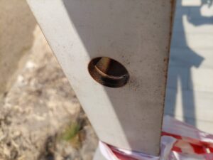 Las tuercas que sujetan los postes a las baldosas deben cambiarse por tuercas ciegas. Esto evitará que los peatones descalzos, especialmente los niños, se lesionen si accidentalmente las pisan. También hay una serie de lugares donde las baldosas están dañadas y deberían haber sido reemplazadas antes de fijar los postes.
